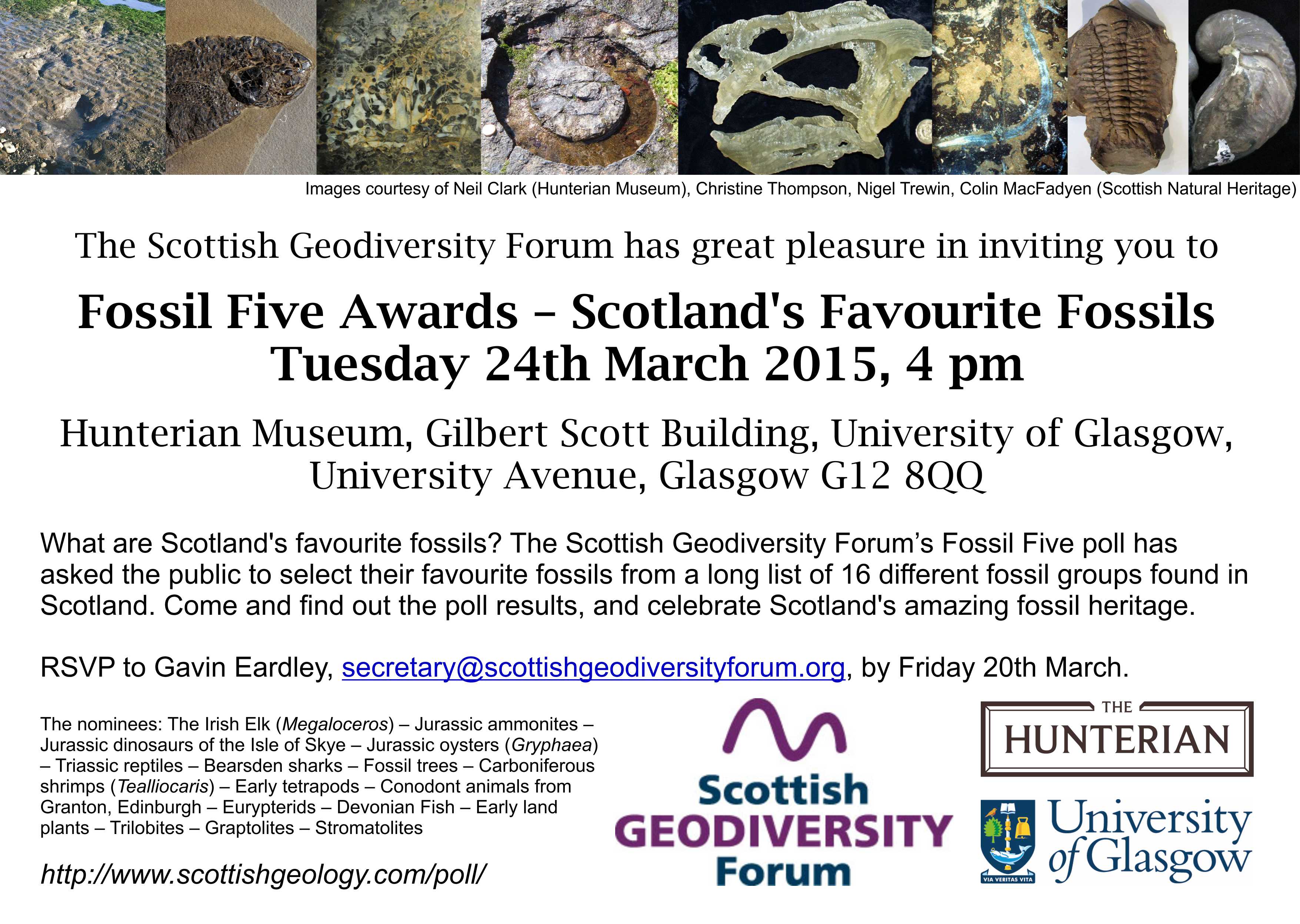 The AGM of the Forum will take place at 5pm at the Hunterian Museum, Glasgow. This follows the Fossil Five Awards …